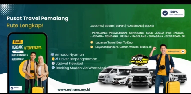 Mencari travel Pemalang murah yang bisa dijemput dari rumah? NQ Trans hadir sebagai solusi terbaik untuk perjalanan Anda. Kami melayani berbagai rute dari Pemalang ke kota-kota besar di Pulau Jawa, termasuk Jakarta, Bogor, Depok, Tangerang, Bekasi, Semarang, Solo, Jogja, Surabaya, hingga Denpasar.